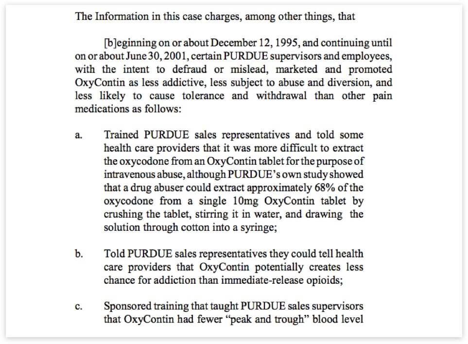 Three of five charges that Purdue Pharma pled guilty to in a 2007 federal lawsuit (Source: U.S. District Court, Western District of Virginia)