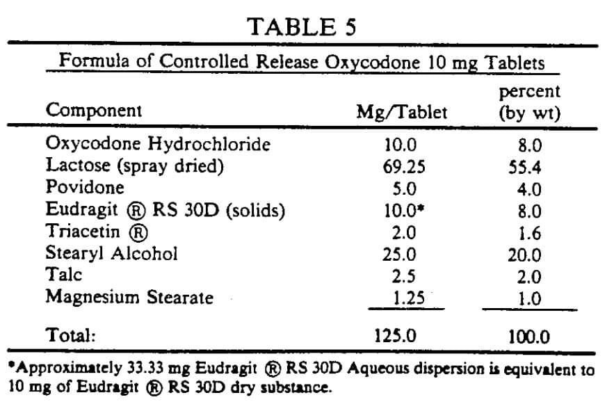 The original formula for OxyContin from Purdue Pharma’s 1992 patent application (Image: U.S. Patent ∓ Trademark Office)